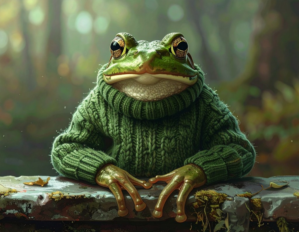 The trouble with Frog Princes is that they are, by their very definition, not what they appear to be. They are slippery customers, masters of deception, illusion and evasion with hidden qualities. Kissing them is a big risk, you may end up with the fairy tale prince we all know about from childhood fairy tales, equally, you may end up with something quite different. But, the original story, before it was prettified, doesn’t involve kissing the frog. The princess was repulsed by the ugly little green jumper. Interpretations could be that she was a selfish little madam and in a fit of rage threw it against a wall in defiance of her father’s wishes to treat it kindly after it had saved her golden ball which she had accidentally dropped down the well.
